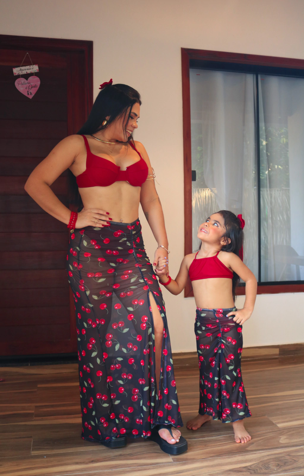 O tule está super em alta! Na estampa cereja ainda mais que é o mood do momento. A saia possui uma leve transparência, com um detalhe de fenda plissada dando um ar de elegância à mais na peça. E fica perfeito para fazer combinadinho mãe e filha.